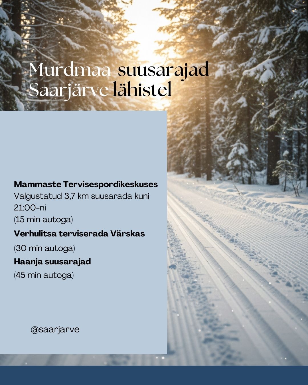 Saarjärve Puhkemaja 2-öine pakett ühendab suusatamise, mugava majutuse ja sooja saunaõhtu.